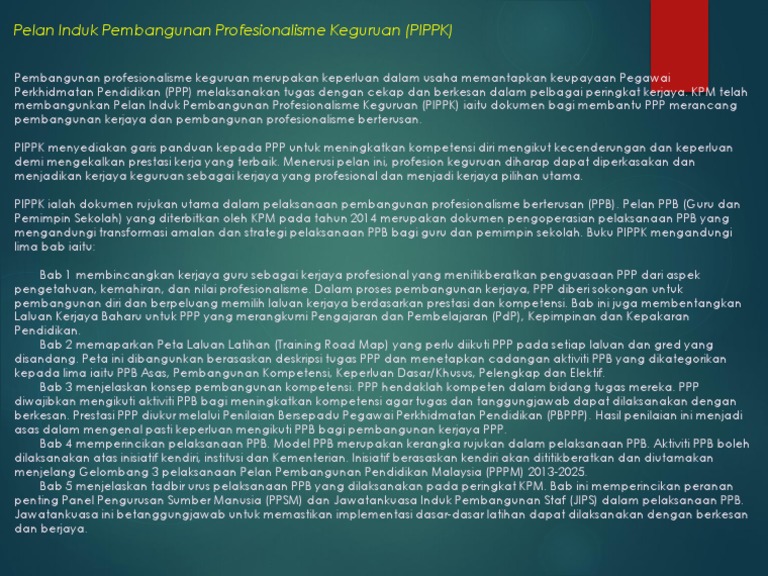 Pelan induk pembangunan profesionalisme keguruan (pippk) iaitu satu dokumen rujukan dalam pelaksanaan profesionalisme. Pelan induk pembangunan profesionaliseme keguruan pippk. Dokumen awal pelan induk pembangunan profesionalisme keguruan untuk rujukan semua pegawai perkhidmatan pendidikan(ppp) di kpm. Pelan strategik pelan pembangunan pendidikan malaysia pendidikan berkualiti kementerian malaysia buku ekonomi pembangunan 11 anjakan pembangunan profesionalisme keguruan grafik pendidikan pembangunan sahsiah ppt. Padu unit pelaksanaan dan prestasi pendidikan. Pdf modul pembelajaran ipg edu3108. Pelan induk pembangunan profesionalisme keguruan. Pelan induk pembangunan wilayah kelantan selatan sehingga 2030. 256 likes · 2 talking about this. Pembangunan profesionalisme keguruan merupakan keperluan dalam usaha memantapkan keupayaan pegawai perkhidmatan pendidikan (ppp) melaksanakan tugas dengan cekap dan berkesan dalam pelbagai peringkat kerjaya. Padu unit pelaksanaan dan prestasi pendidikan. 4.0 pembangunan profesionalisme keguruan pembangunan profesionalisme keguruan adalah merujuk sebagai satu aktiviti dan juga proses yang direka bentuk bagi mengembangkan pengetahuan profesional, sikap dan kemahiran pendidik agar mereka berupaya meningkatkan. Fakultas tarbiyah dan ilmu keguruan ftik.