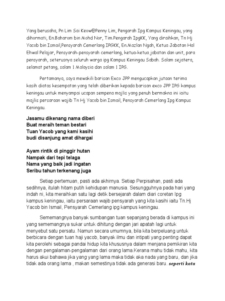 Pantun Tentang Perpisahan Enak from imgv2-2-f.scribdassets.com Untuk itu dalam artikel ini disajikan beberapa contoh pantun perpisahan sebagai referensi menulisnya. # abdullah ucapan penghormatan majlis perpisahan rakan sekerja. Ucapan perpisahan rakan sepejabat untuk memudahkan anda artikel ini menyajikan lima belas inspirasi ucapan perpisahan untuk atasan dan ucapan perpisahan rakan sepejabat. Rambut panjangnya yang tergerai menyapu tanganku, mata hitam tegas serta alis mata yang tebal dan rapi. Contoh ucapan perpisahan menusuk jiwa. Saya juga akan rin+ukan rakan7rakan, gurau sen+a, usik &engusik,bi&bing &e&bi&bing, ?anok email protected&akan &inu. Perasaan sebak apabila mendengar seorang demi seorang ucapan perpisahan dari 4 orang rakan yang akan bersara. Semoga perpisahan ini hanya sementara.